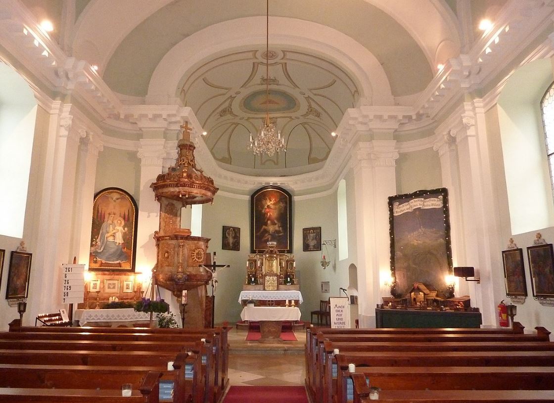 Das Kircheninnere zeigt ein zweijochige Langhaus mit gerundeten Ecken und queroblongen Platzlgewölben auf kräftigen Doppelpilastern mit breiten Gurtbögen hat ein ausladendes, kräftiges Zahnschnittgebälk, das sich im Chor umlaufend fortsetzt. Das eingezogene Vorhallenjoch trägt eine vorschwingende Empore. Der Chor schließt korbbogenförmig und hat ein gedrücktes Tonnengewölbe.